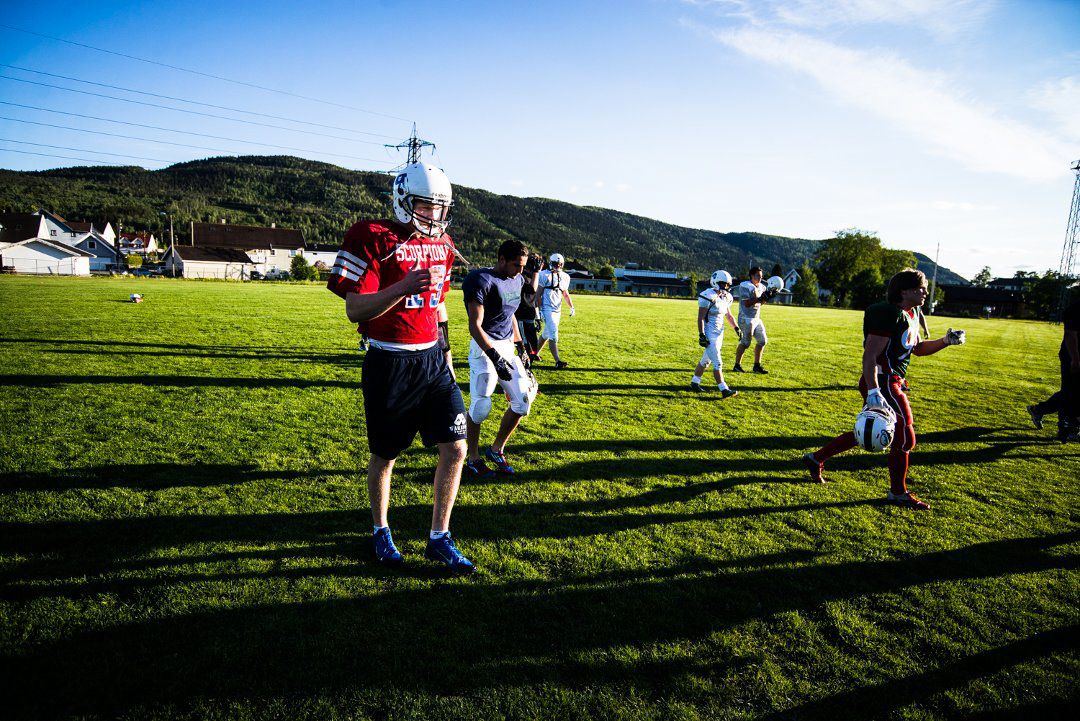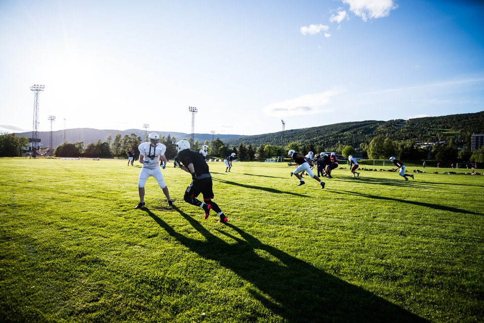 Midt på gressbanen på Berskaug er et tyvetalls menn mellom 17 og 30 år. Den ene skriker «twentythree, set, hut!» og spillet starter. Det går fort. Den ovale ballen kastes til en running back, men som fort blir taklet av en motspiller. De repeterer det samme spillet igjen. - Det er viktig å få inn et spill som man kan bruke i kamper. Men vi mangler de større karene, sier «head coach», eller hovedtrener om du vil, Roger Westby.